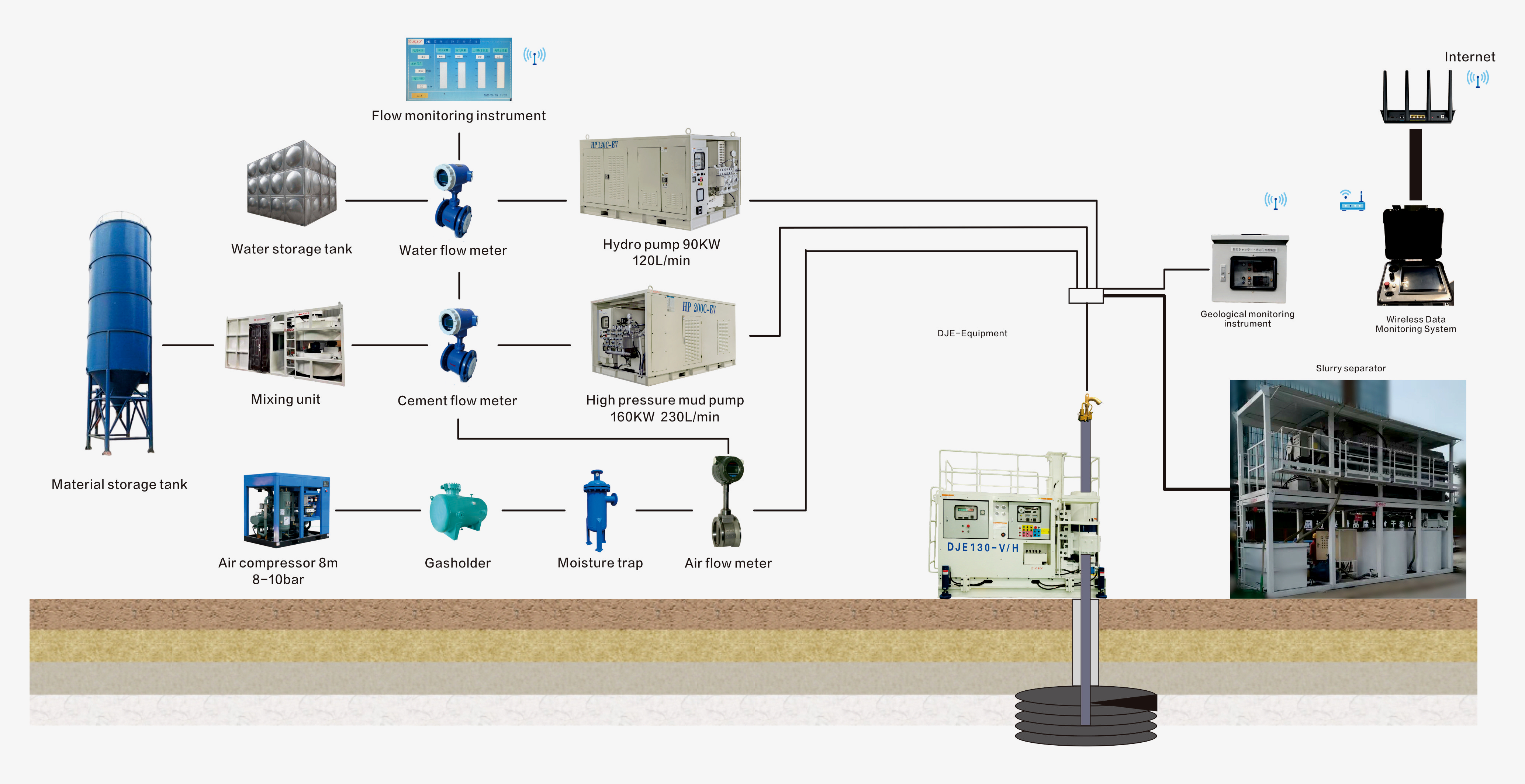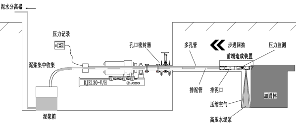 DJE工法又稱全方位高壓噴射注漿工法,利用高壓水、高壓空氣和高壓水泥漿三種介質(zhì),通過獨特的多孔管和前端造成裝置(習慣稱之為鉆頭),以高壓射流切割破壞周圍土體,將硬化材料漿液加壓輸送、噴射、切削地層、混合、排泥、集中泥漿、泥漿固化運送一系列工序作為監(jiān)控對象,是一種能進行水平、垂直及傾斜和360°全方位地基加固的施工工法。該工法的最大特征是實現(xiàn)了孔內(nèi)強制排泥,并通過調(diào)整排泥量來控制地內(nèi)壓力,從而能夠有效地抑制隨噴射攪拌而產(chǎn)生的地基隆起或沉降,大幅度減少對環(huán)境的影響。